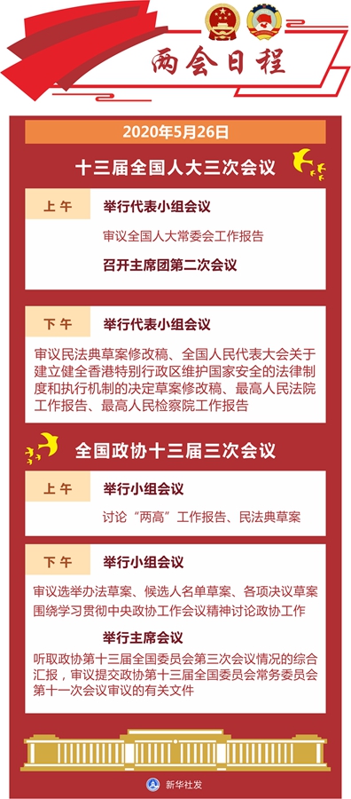 新华社北京5月25日电 十三届全国人大三次会议26日上午举行代表小组会议,审议全国人大常委会工作报告;11时召开主席团第二次会议。下午举行代表小组会议,审议民法典草案修改稿、全国人民代表大会关于建立健全香港特别行政区维护国家安全的法律制度和执行机制的决定草案修改稿、最高人民法院工作报告、最高人民检察院工作报告。